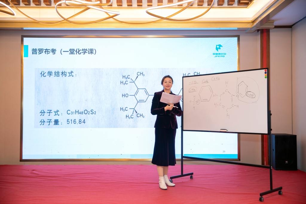 隨后總經(jīng)理王軼超通過一堂生動(dòng)的化學(xué)課,向大家講解基礎(chǔ)有機(jī)化學(xué)知識(shí),拆分普羅布考分子結(jié)構(gòu)式,增加大家對產(chǎn)品的了解。